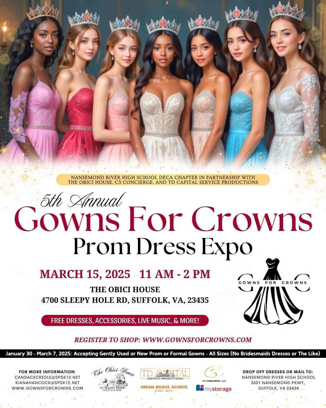 Join us for the 4th Annual Gowns For Crowns Prom Expo on March 16, 2024, from 11 AM to 2 PM at The Obici House, 4700 Sleepy Hole Rd., Suffolk, VA 23434.